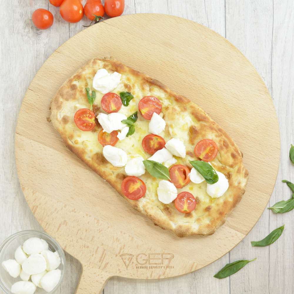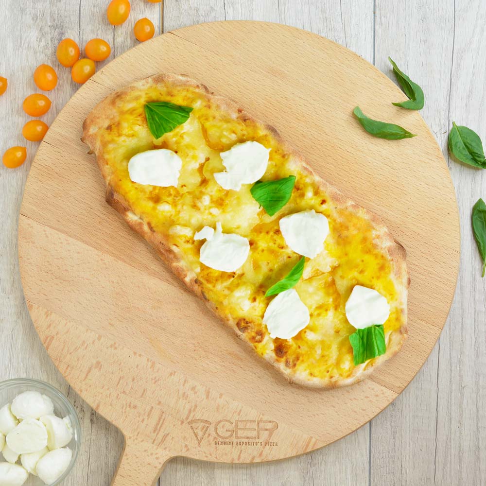 Base bianca con mozzarella, mozzarella di bufala campana DOP e pomodorini a crudo