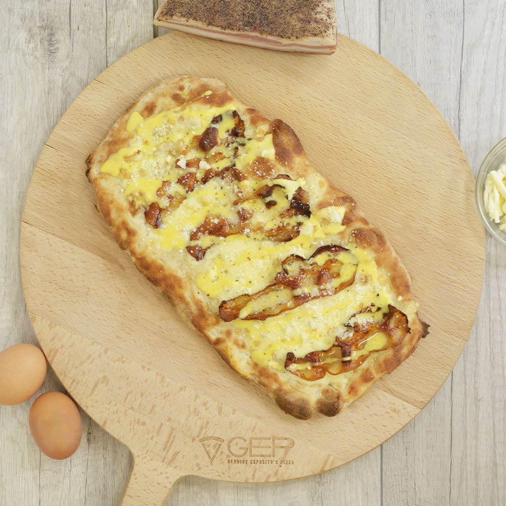 Base bianca con salsa all'uovo, pecorino romano, guanciale e pepe