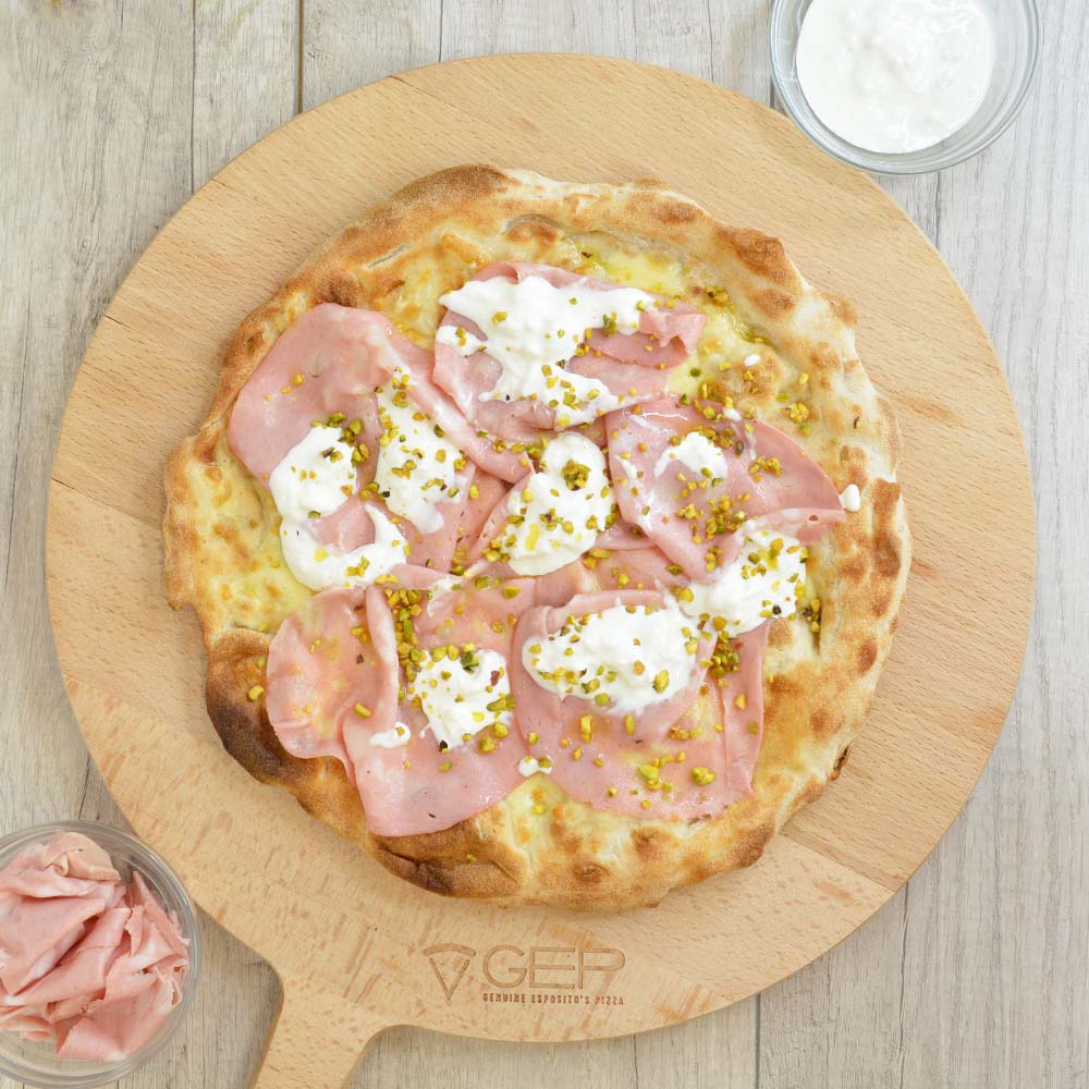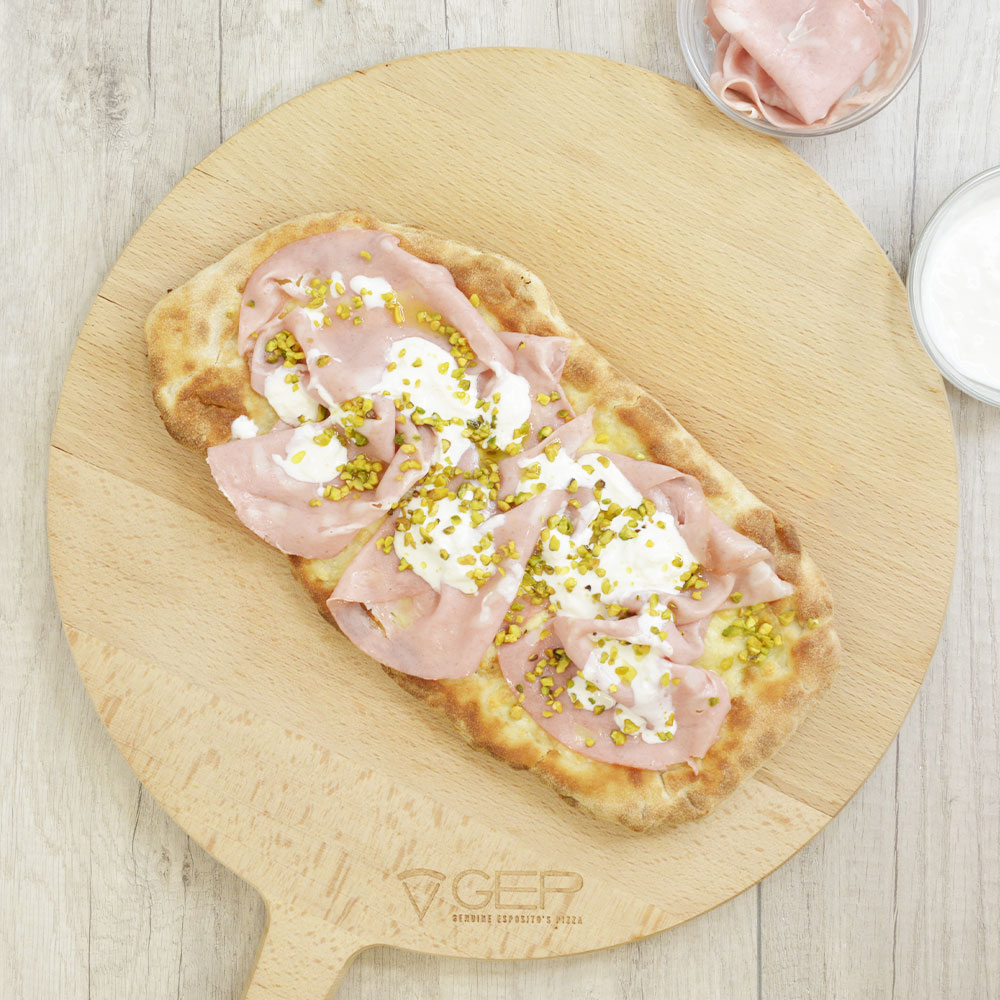 Base bianca con mortadella, stracciatella e pistacchi