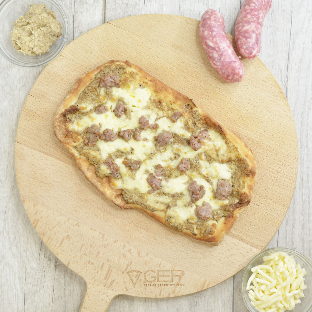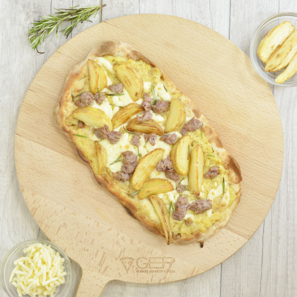 Base bianca con mozzarella, vellutata di patate, salsiccia, patatine arrosto