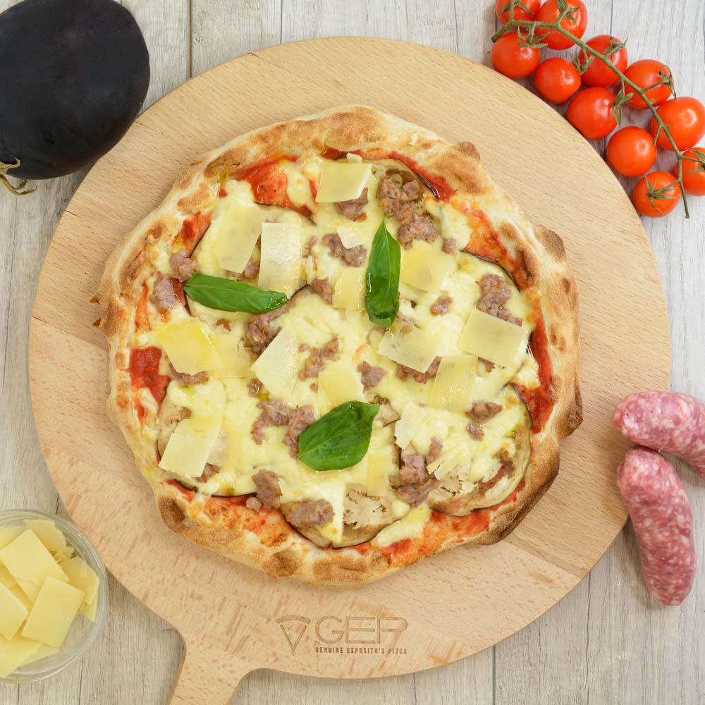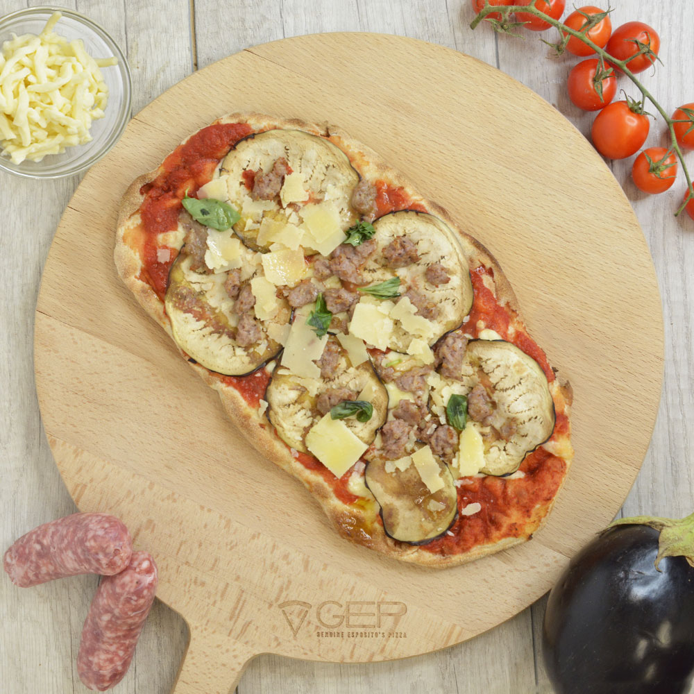 Base rossa con melanzane grigliate, salsiccia e parmigiano in scaglie