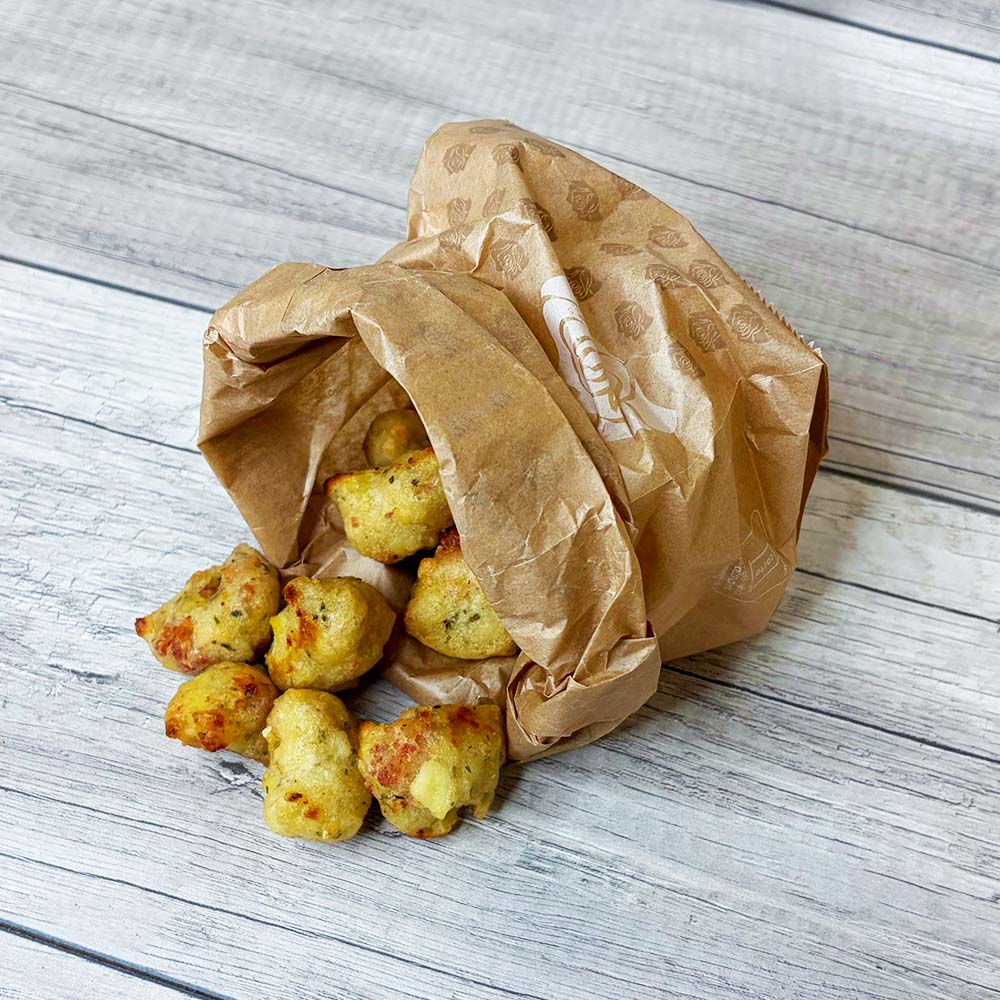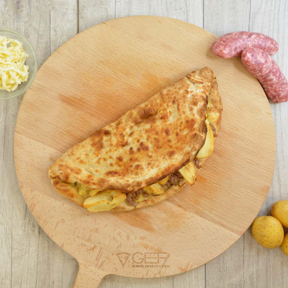 Ripiena di mozzarella, vellutata di patate, salsiccia, patatine arrosto