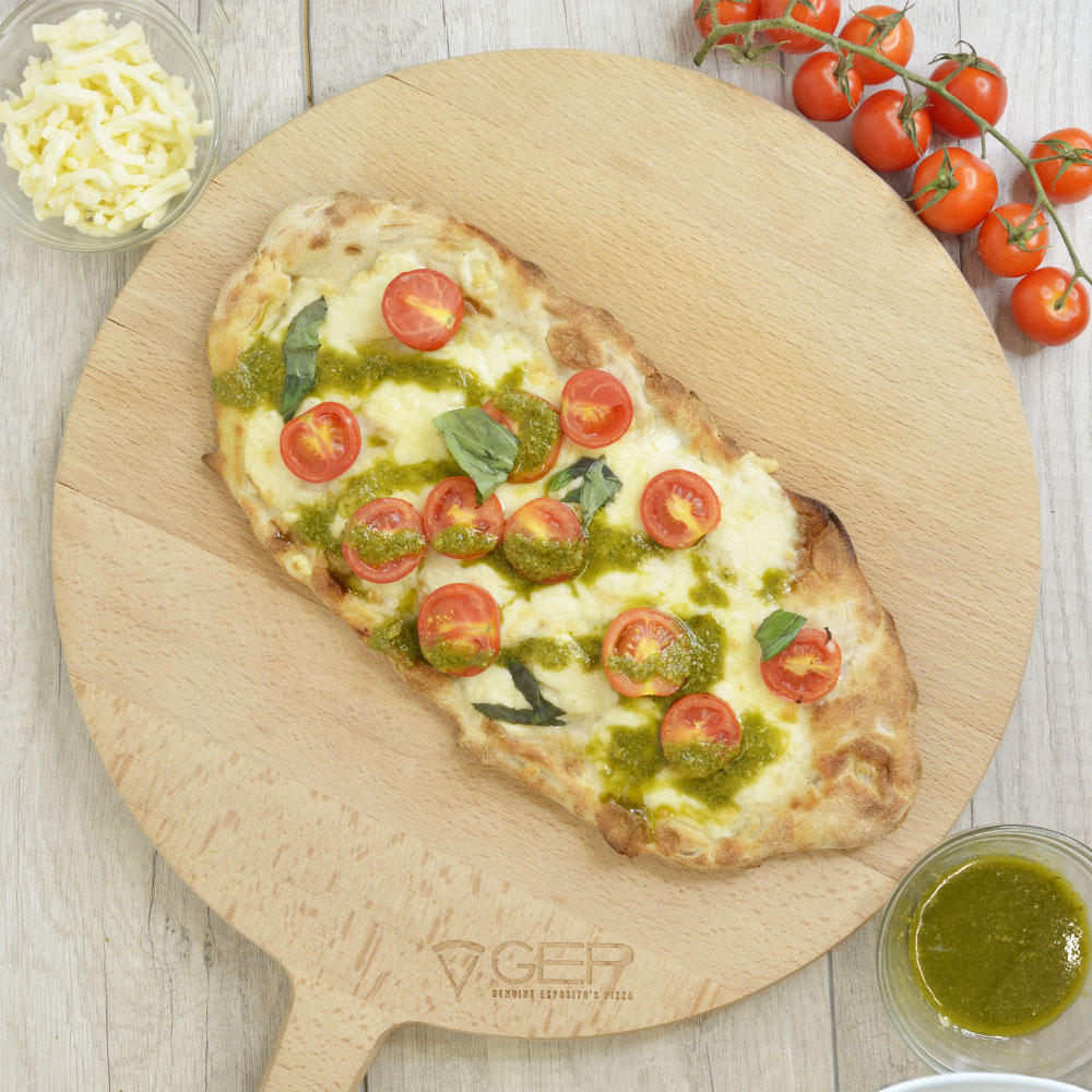 Base bianca con mozzarella, pesto, pomodorini a crudo e provola affumicata