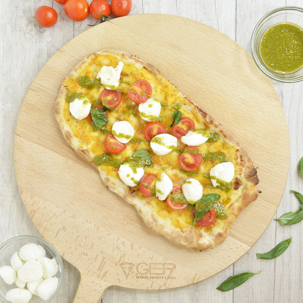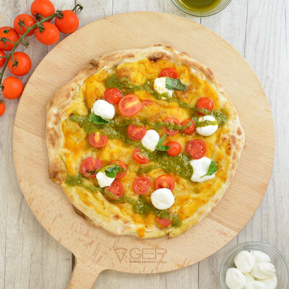 Base bianca con salsa di pomodoro giallo, pesto, pomodorini a crudo e mozzarella di bufala campana DOP