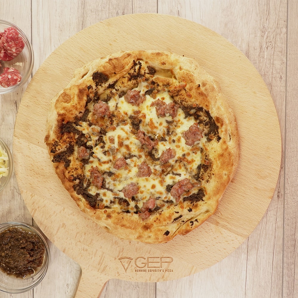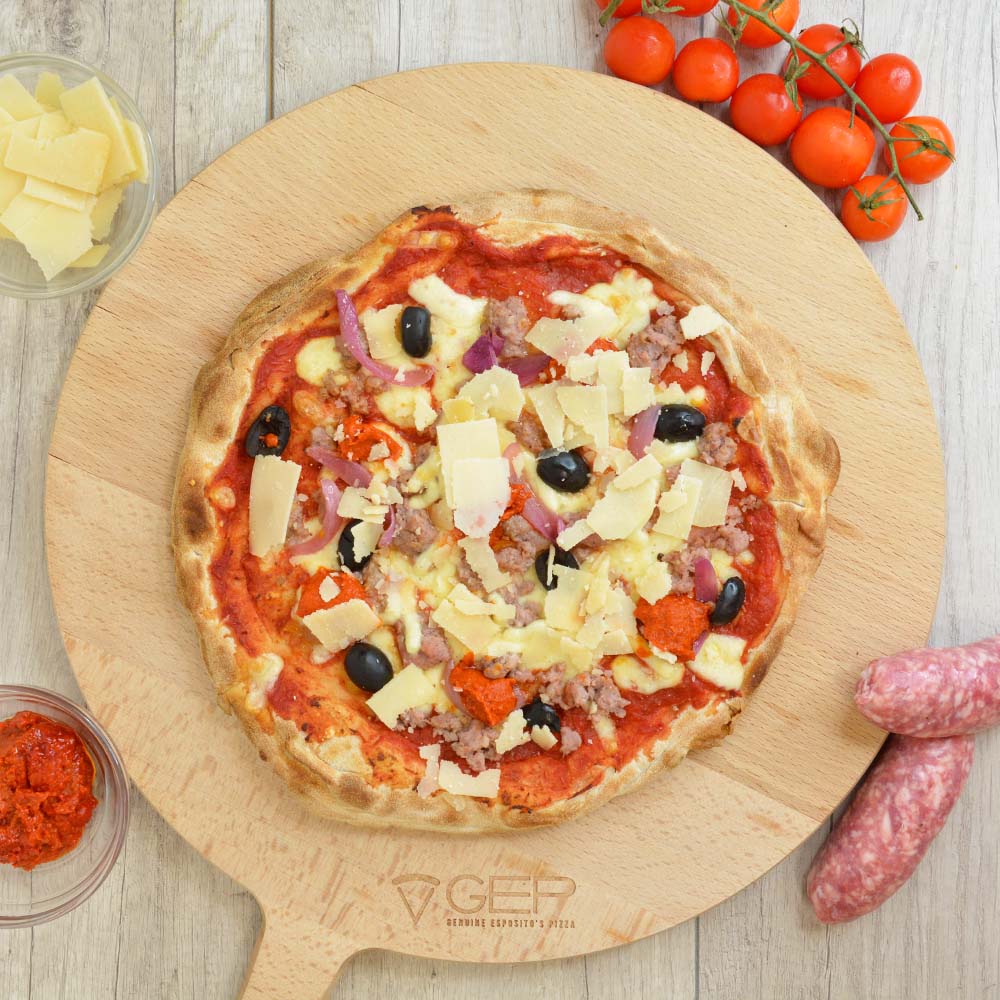 Base margherita con salsiccia, nduja, cipolla caramellata, olive e scaglie di parmigiano