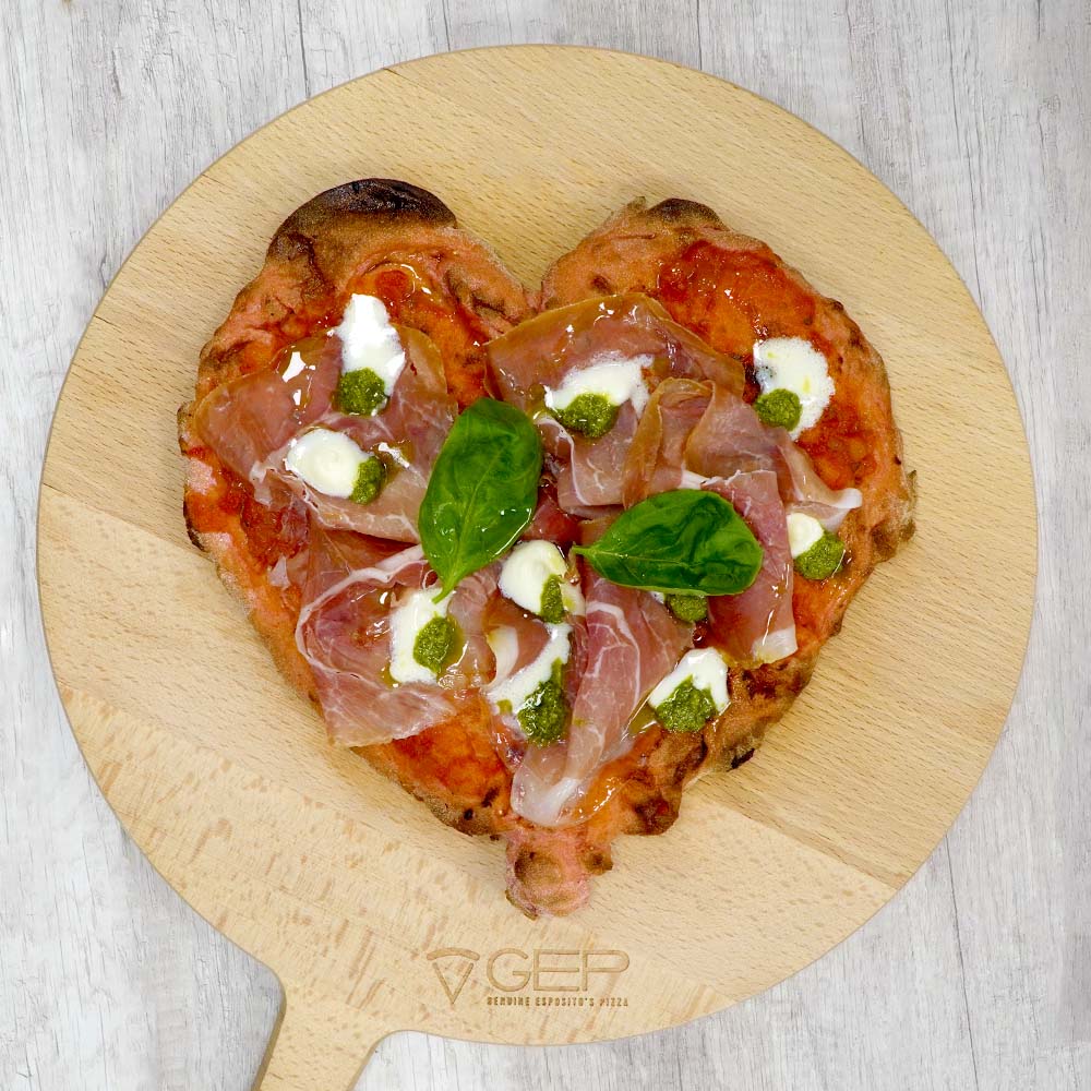 Base rossa con prosciutto crudo, spuma di bufala, pesto e basilico