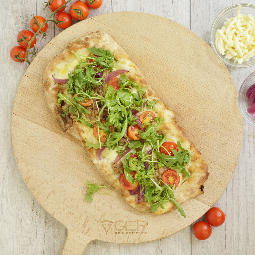 Tonno, cipolla caramellata, mozzarella, rucola e pomodorini