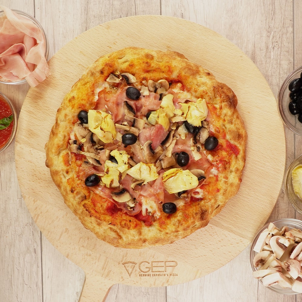 Base margherita con prosciutto cotto, funghi, olive e carciofini