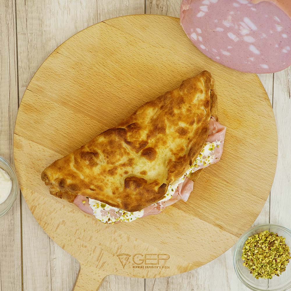 Ripiena di mortadella, stracciatella di burrata, granella di pistacchio e mozzarella