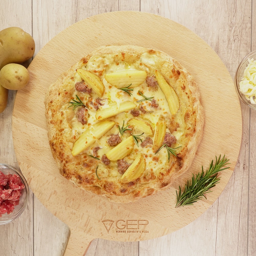 Base bianca con mozzarella, vellutata di patate, salsiccia e patatine arrostoBase margherita con salsiccia